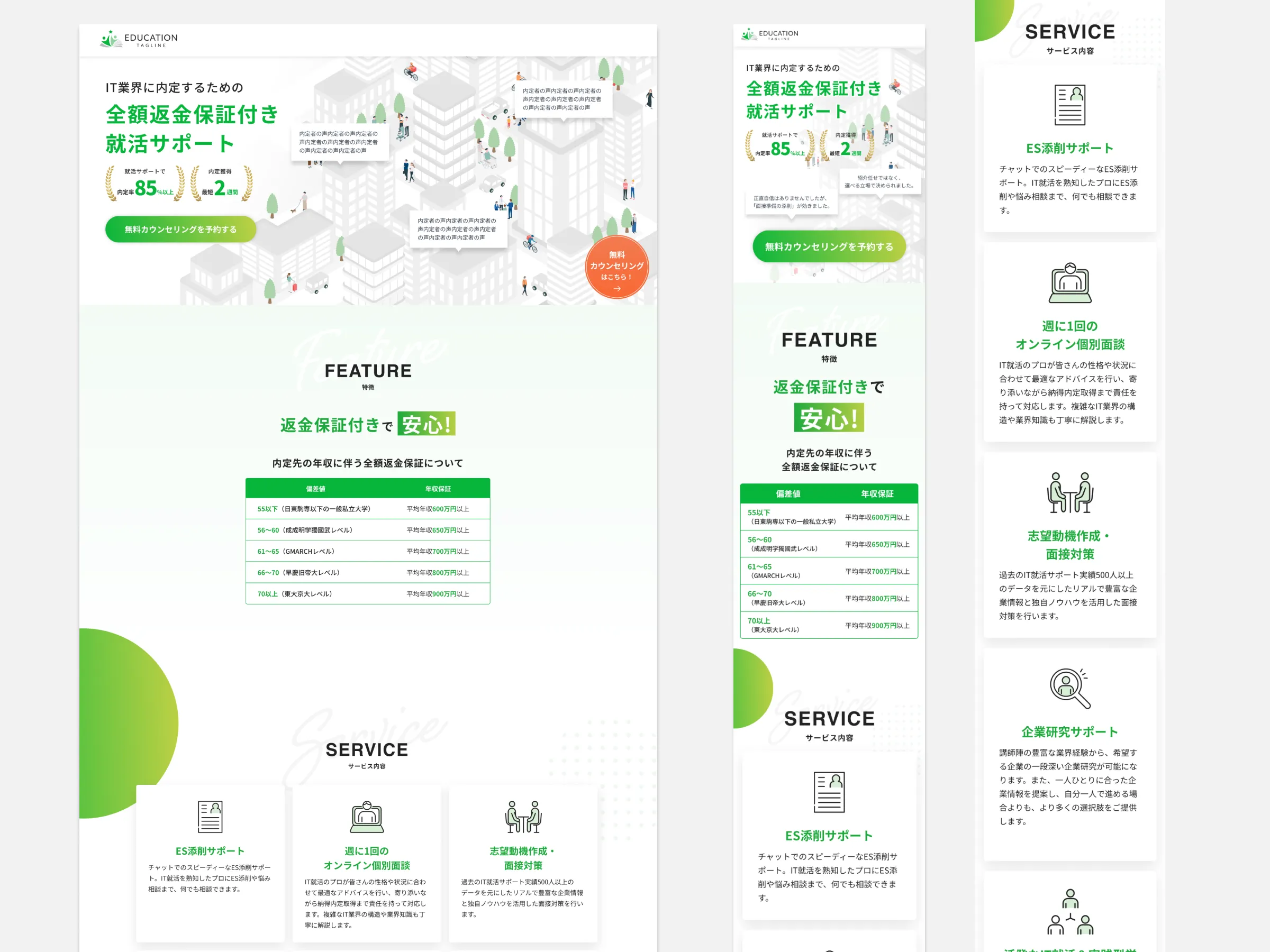 スクロールに沿って情報の流れが途切れないよう、視線移動と情報量のバランスを調整。 PC・スマートフォンいずれの環境でも ストレスなく全体像を把握できる体験設計を意識しました。