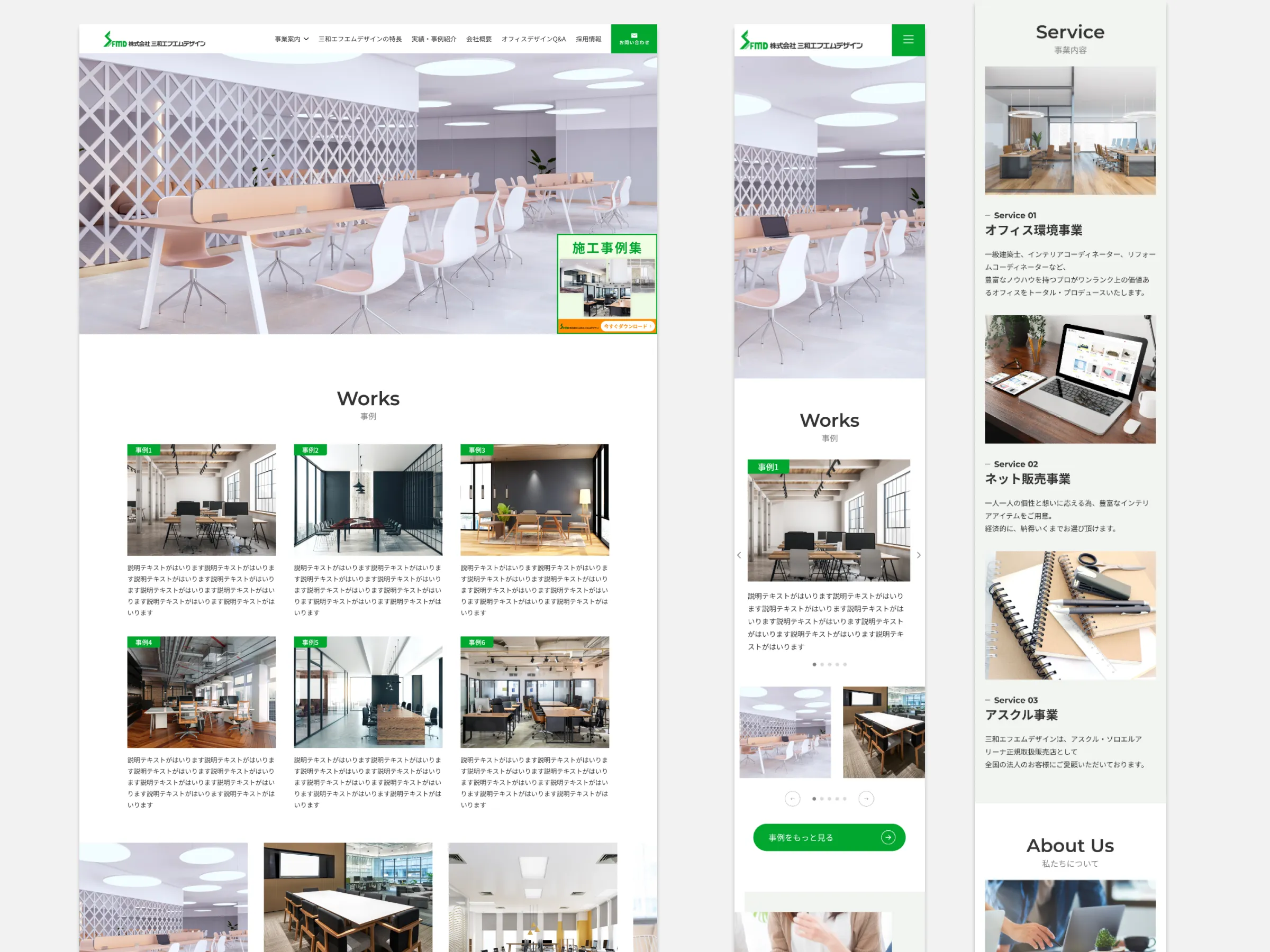 白を基調とした余白のあるレイアウトと、統一感のあるビジュアルにより、オフィスデザイン会社としての信頼感・専門性が伝わるデザインにしています。