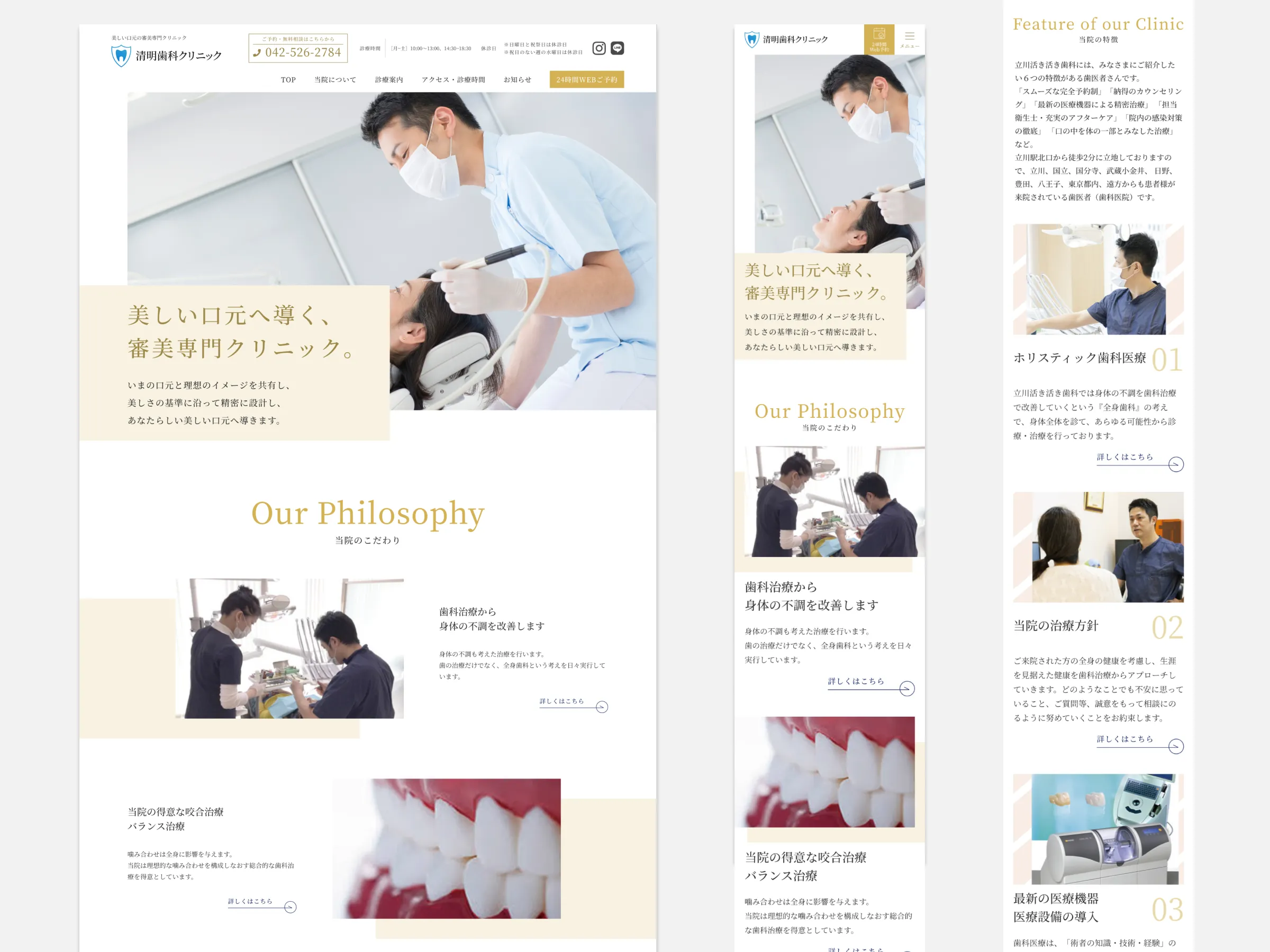 「Our Philosophy」「Feature of our Clinic」などのセクションを設け、医院の考え方や他院との差別化ポイントを段階的に理解できる構成にしています。抽象的な理念だけでなく、具体的な取り組みや設備紹介を組み合わせることで、信頼性を高めています。