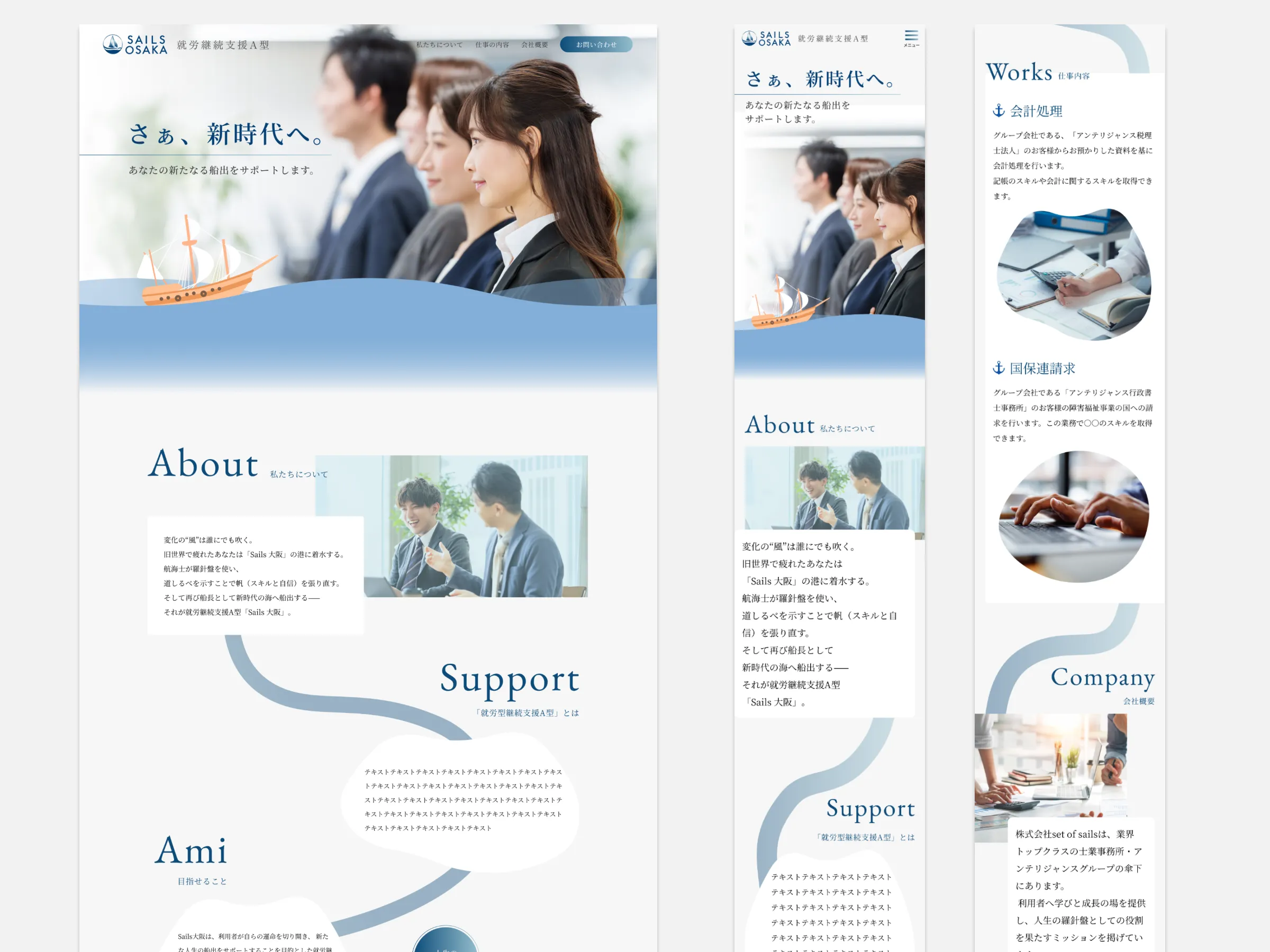 トップページから各セクションにかけて、「航海」「風」「船出」といった世界観を一貫して表現しています。波のような曲線レイアウトや船のビジュアルを用いることで、情報を追う流れそのものが人生の航路をなぞる構成となっており、利用者が自然に未来像を思い描けるデザインにしています。