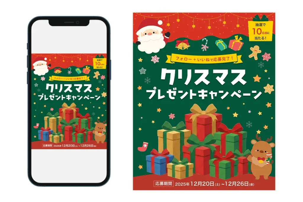 制作サイト サイズ 費用目安 制作日数 Instagram広告 1080px×1080px 5,000円 2日程度 制作ポイント 一目で“イベント感”が伝わるビジュアル設計 サンタやプレゼント、星モチーフを全面に配置し、 […]