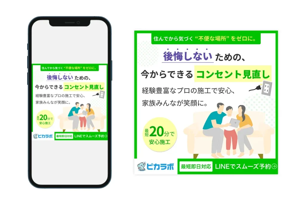 業種 制作サイト 配信エリア サイズ 費用目安 制作日数 電気工事サービス Instagram広告 大阪 1080px×1080px 5,000円 2日程度 制作ポイント 暮らし目線のビジュアルで安心感を演出 電気工事= […]